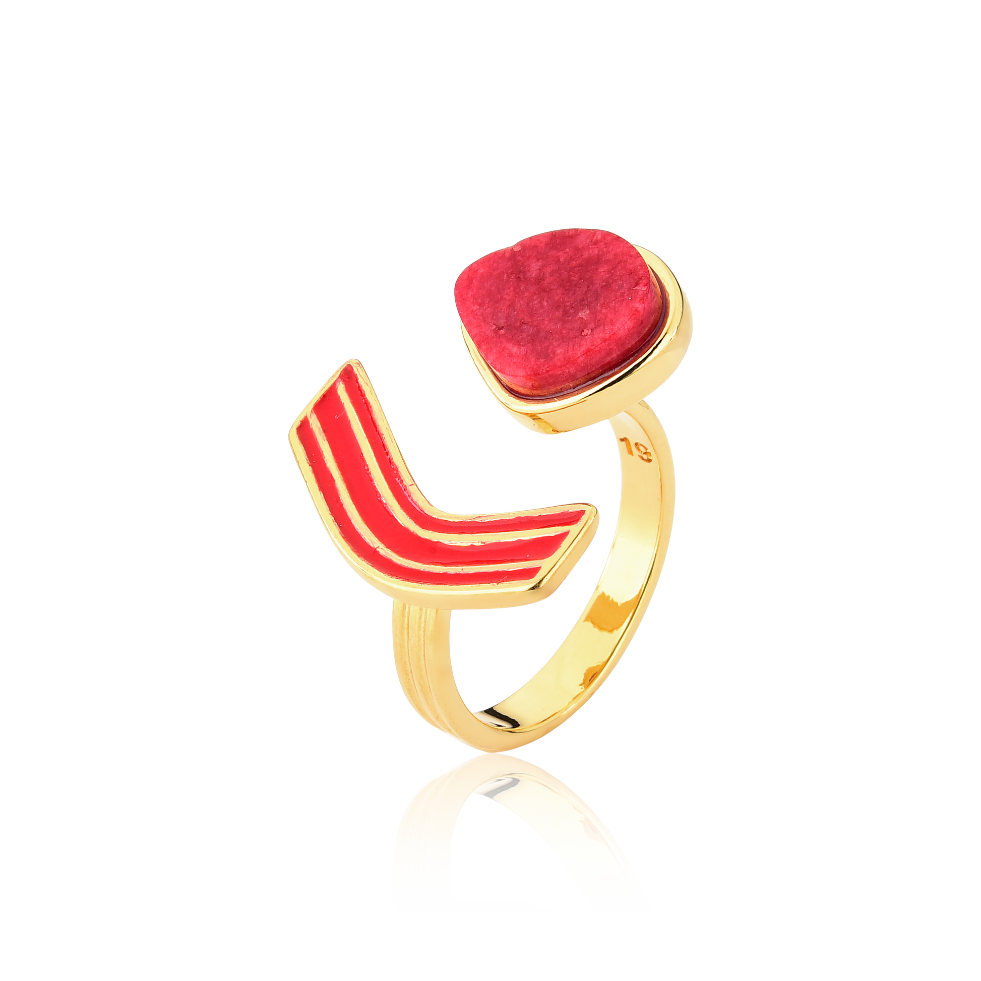 Anel Feldspato Vermelho Esmaltado é uma joia de design contemporâneo e expressão marcante. A combinação do feldspato vermelho natural com o detalhe esmaltado cria um contraste sofisticado, moderno e cheio de personalidade.