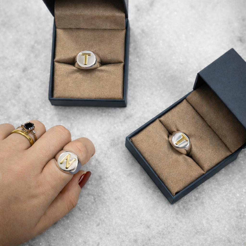 Personalizado com a sua inicial em ouro 18k maciço, sobre base em prata 950, o Anel Identidade atravessa o tempo como símbolo de quem você é e do que importa. Uma peça criada para marcar histórias, nomes e significados pessoais.