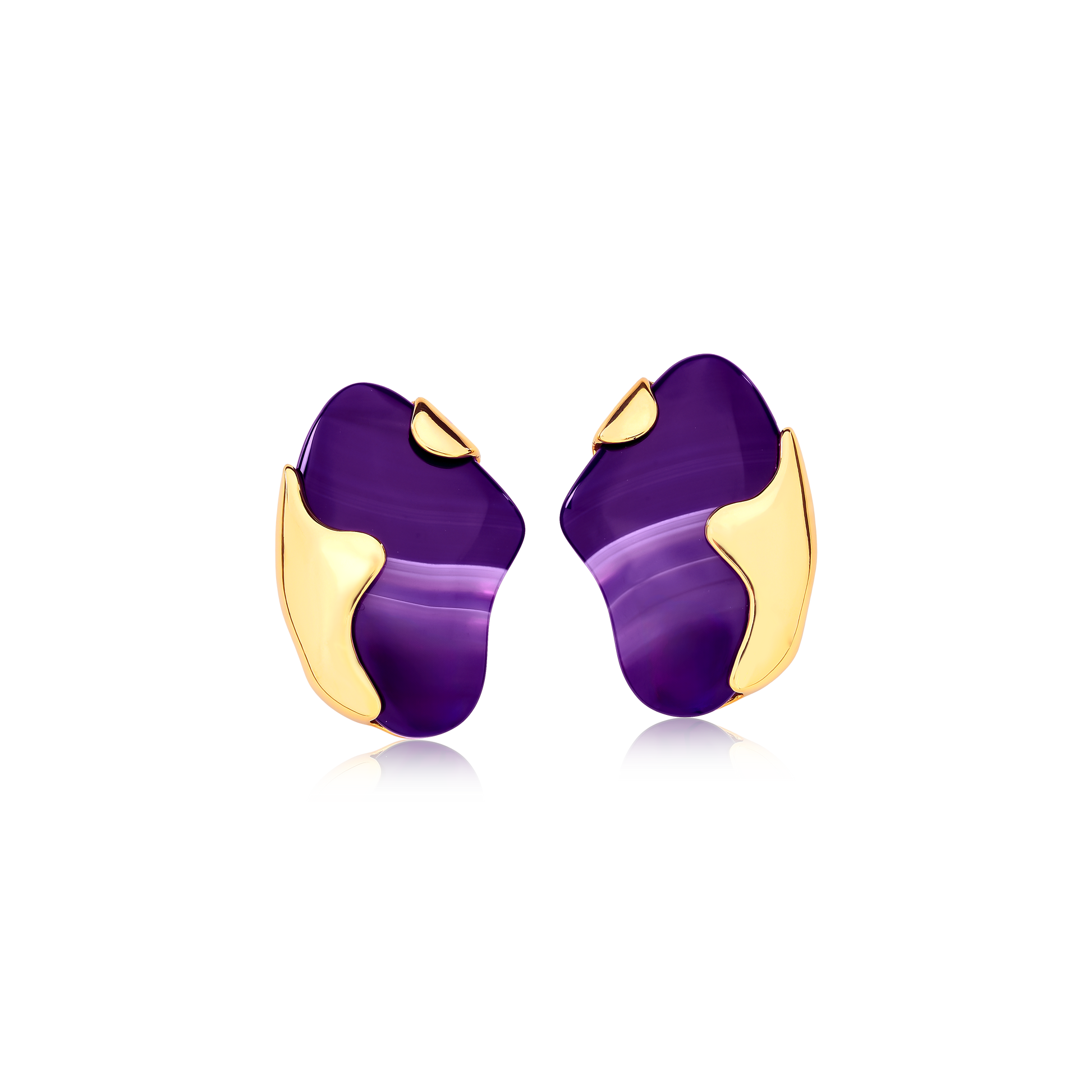 O banho de ouro envolve a pedra de forma fluida e escultural, valorizando seu desenho natural e criando um contraste elegante entre o brilho dourado e a intensidade do roxo. O design anatômico proporciona conforto ao uso, enquanto o formato contemporâneo transforma o brinco em uma peça de destaque imediato.