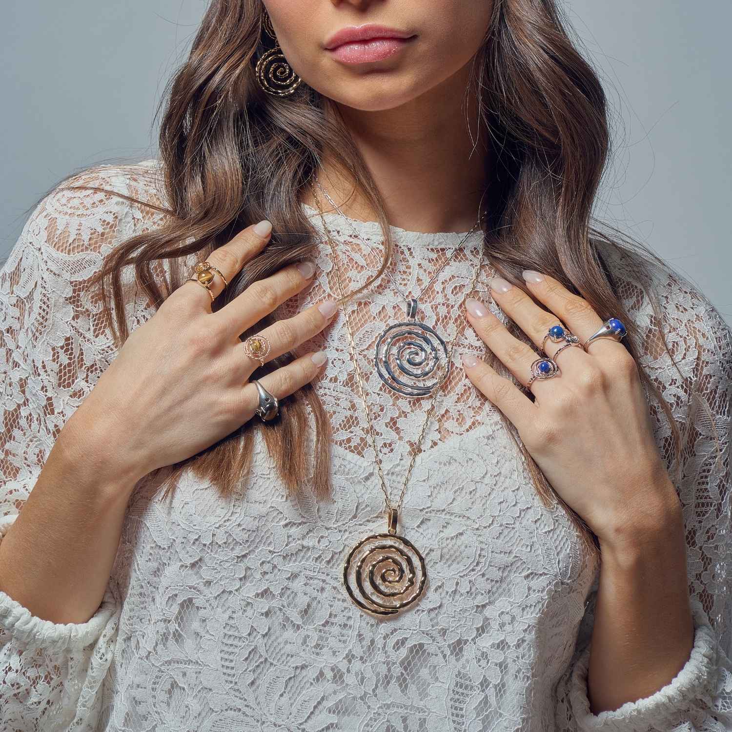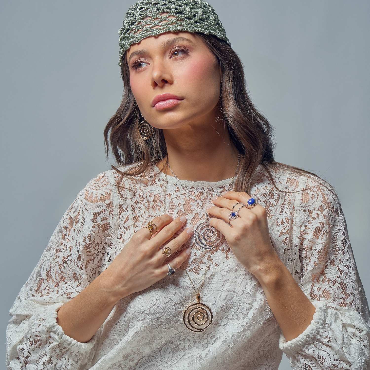 O Colar Ciclos é a representação pura do movimento e da continuidade. Inspirado nas espirais da vida, seu design autoral em metal martelado reflete luz e textura com naturalidade, criando uma peça que é, ao mesmo tempo, escultural e leve.